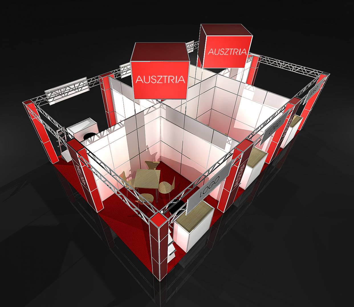 A stand fölé kocka látványelemeket helyeztünk a cég logójával. A válaszfalak és az oszlopok képviselik