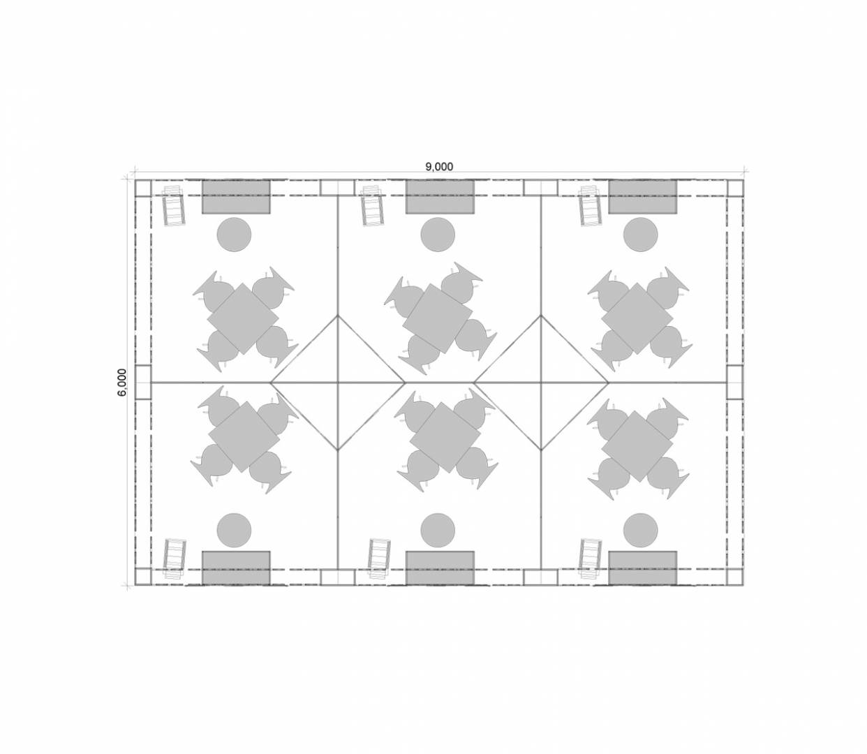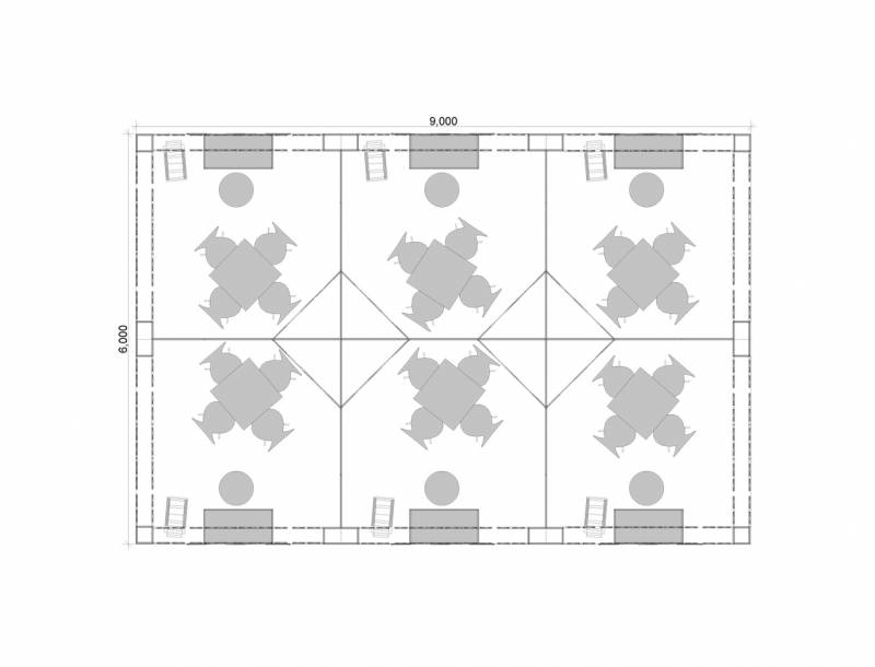 A téglalap alapterületű standon 6 darab, egyenként 9 m2-es négyzet alapterületű bemutatórészt